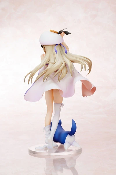 Her clothes appear to be falling off as she walks forward holding her beret atop her head. From her leggings to her unzipped skirt and open blouse, she’s nearly exposed in every direction! The slight breeze blowing her long hair and cape gives an extra dimension of movement to this one of a kind figure.