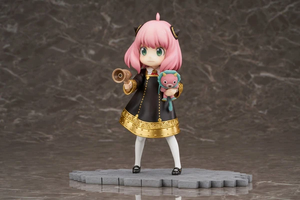 Anya is seen wearing her Eden school uniform and posing brilliantly on the cobblestones with her stuffed toy chimera and a toy gun in her hand! Her cute expression and short pink hair remain true to her character’s design as seen in the series. Anya’s uniform has a luxurious design with gold decoration on black. Hair ornaments, socks, and even shoes have been carefully modeled.