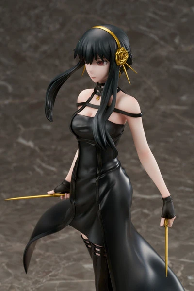 Yor is seen wearing her assassin outfit and poised elegantly on the cobblestones with her weapons of choice in hand! Her serious expression and long black hair remain true to her character’s design as seen in the series.Â