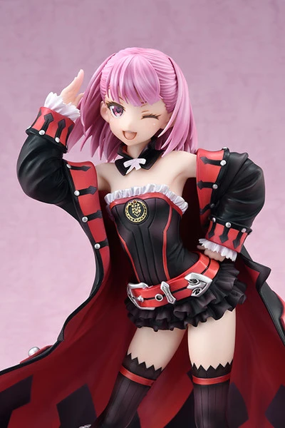 The Russian master magus of Fate/Grand Order, Helena Blavatsky, has arrived! Based on her Caster Stage 3 form, she looks delighted to show off her magical prowess. She salutes you with a coy wink, her black and red trenchcoat splaying out behind her as she strikes her pose. Her strapless top and matching frilled skirt show that she plans to bring some flirty fun to the battlefield. Her hat is removable, to better show off her chin-length pink hair. And to aid in her hands-free spellcasting, she comes with a levitating grimoire and one of her trusty Colonel Olcott automata, matching her salute with his own flowing red cape.