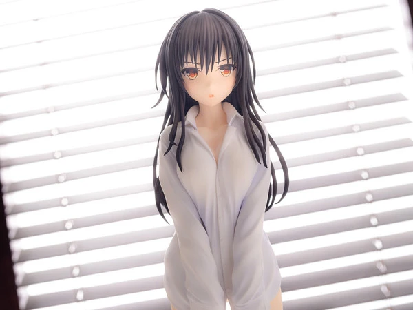 Yui is seen wearing a white button-up shirt, her piercing golden eyes express a “what do you think you are looking at?” expression. As she stands atop a hardwood floor styled base her long dark hair, each strand perfectly shaded and detailed, lays elegantly down her thin frame.