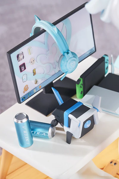 The PA-15 in relax mode is perfectly reproduced, with a calmer hairstyle than usual, as well as a fluffy, nearly transparent jacket. She holds a controller in one hand as she’s caught playing videogames and enjoying snacks. PA-15 has a blue beanbag chair, monitor and headphones on hand to finish the themed set.