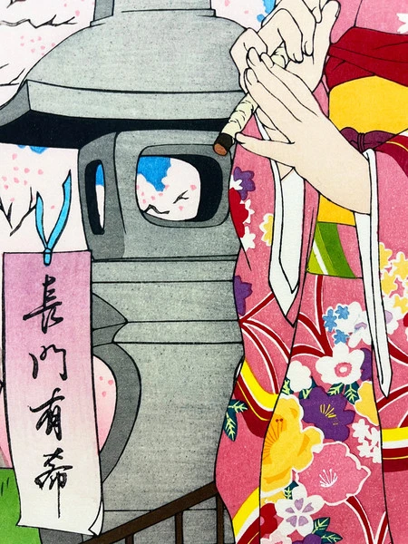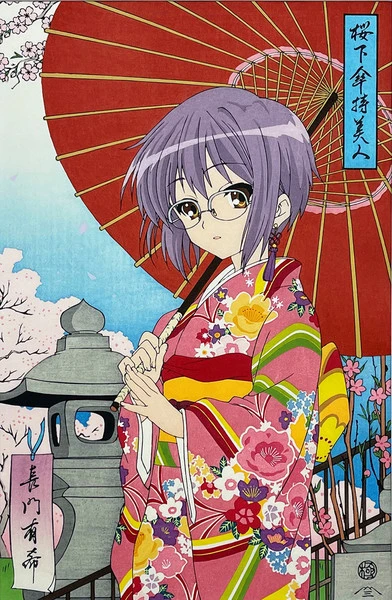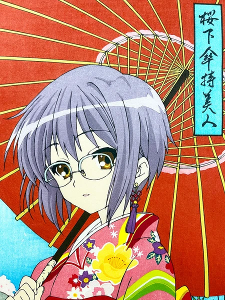 This woodblock print features a special illustration drawn during the release of The Disappearance of Haruhi Suzumiya movie, in which Nagato is wearing a glamorous kimono with a Japanese umbrella in hand. A row of cherry blossom and plum trees are in the background, depicting Nagato in a spring day in full bloom. The Ouka Kasamochi Bijin ukiyo-e also has a classic name, adding a Japanese feel to the masterpiece.