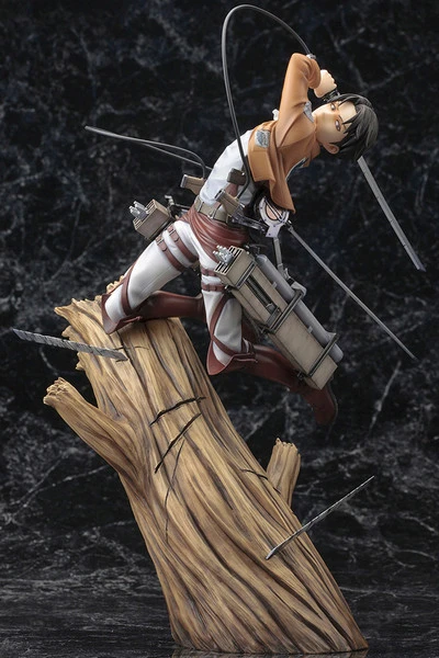 Sculpted by Shin Tanabe, Levi is over 11 inches tall (1/8 scale) as he hurtles over the trees, and his matching display based makes him the perfect companion to the other Attack on Titan ARTFX J Statues: Eren Yeager and Mikasa Ackerman.