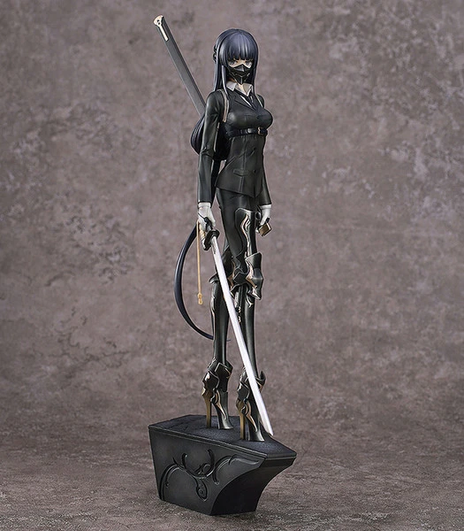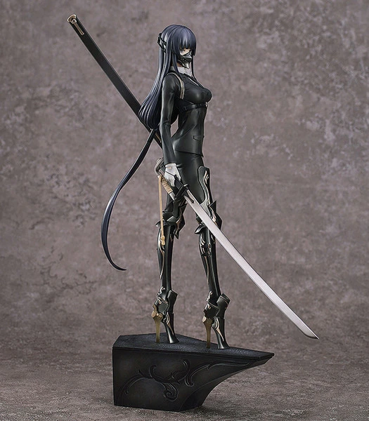The figure features a chic black suit, unique leg equipment and a large sword. Her elegant physique accentuated by her suit, heavy equipment and weapon come together to create a figure that combines both roughness and femininity.