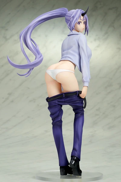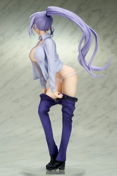 Shion is seen with her pants lowered down to her knees, panties exposed, and her blouse hanging wide open! Quickly peering over her shoulder, her long purple hair moving with the motion, she develops a blushing expression as she sees you catching a glimpse!Â