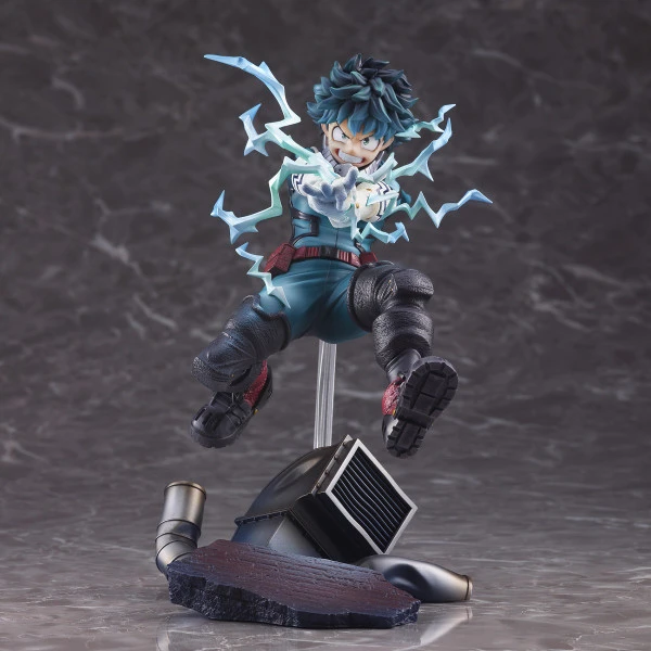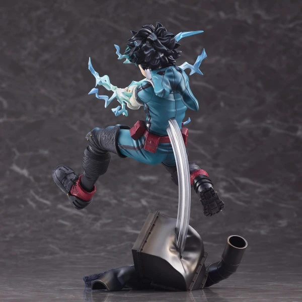 Seen in a dynamic pose atop a themed base, Izuku activates his quirk, releasing a lightning quick flick from the tips of his finger.